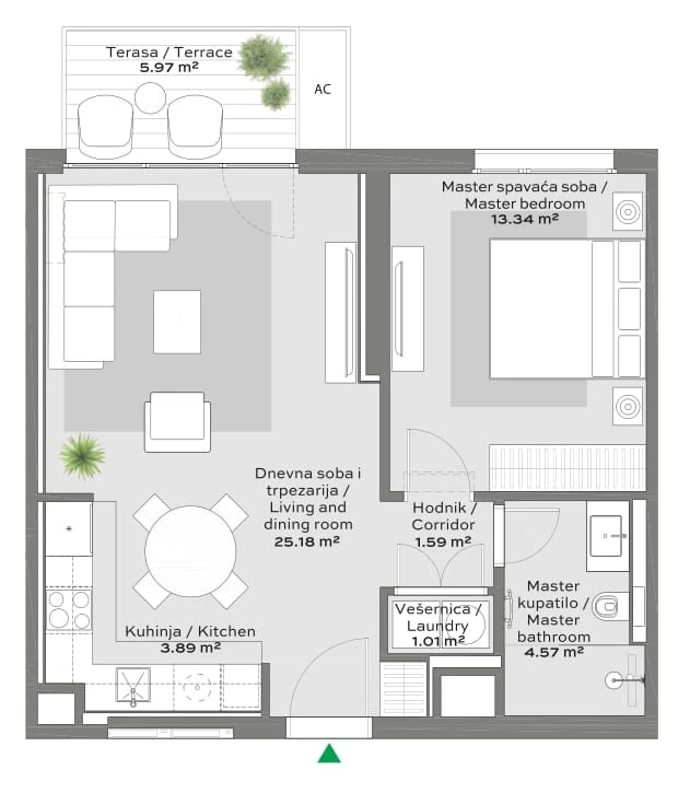 Stan se nalazi na 5. spratu i prostire se na optimalno organizovanom prostoru. Sastoji se od: ulaznog hodnika, prostranog dnevnog boravka sa izlazom na terasu i pogledom ka reci, moderne kuhinje sa trpezarijom, udobne spavaće sobe, kupatila i vešernice.