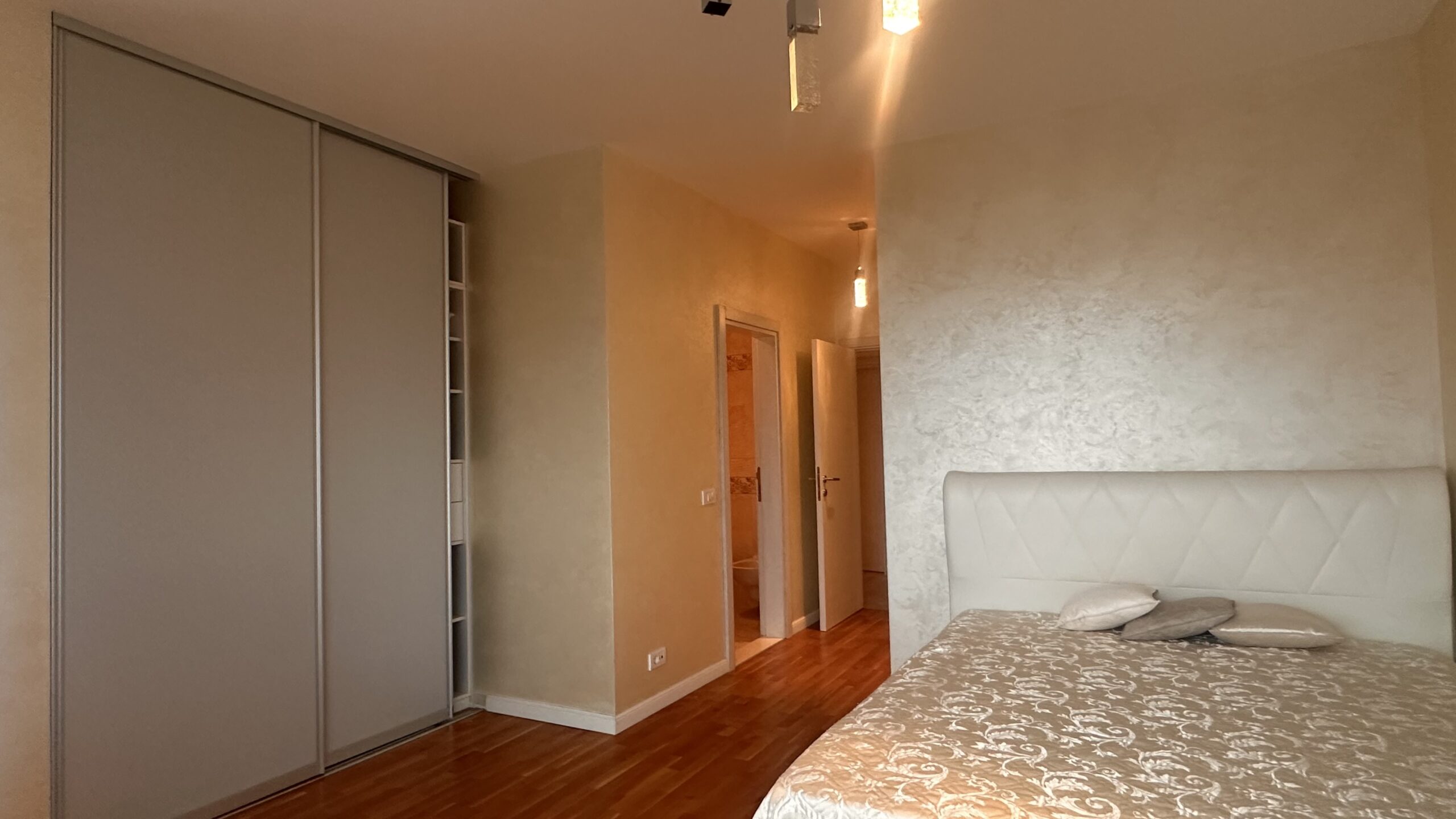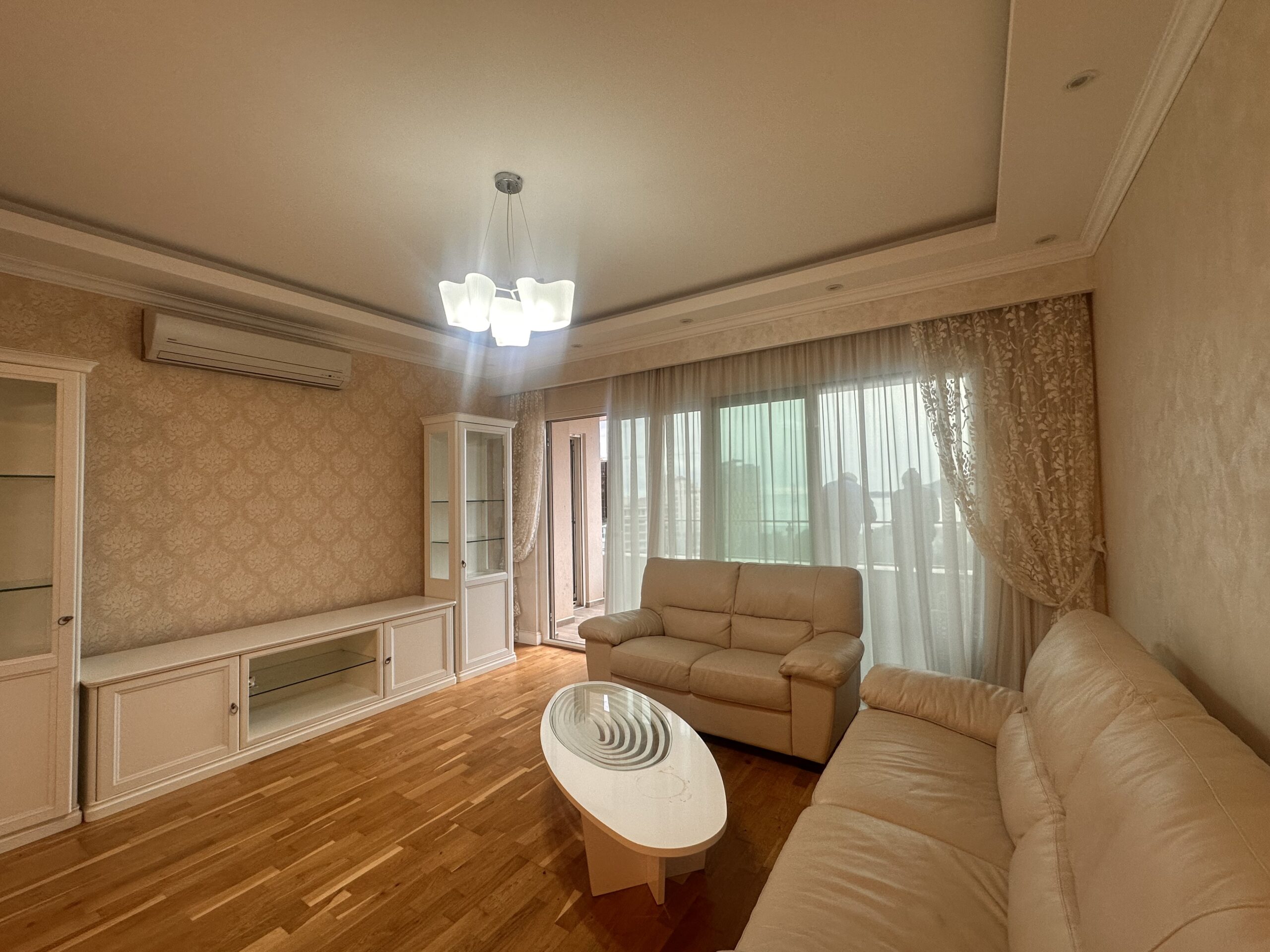 The apartment is spacious and features a functional layout. It consists of an entrance hall, a kitchen with dining area, a living room, a hallway, three bedrooms, two bathrooms, a guest toilet, and a large terrace. One of the bedrooms is a master bedroom with its own bathroom and built-in wardrobe. All rooms are air-conditioned.