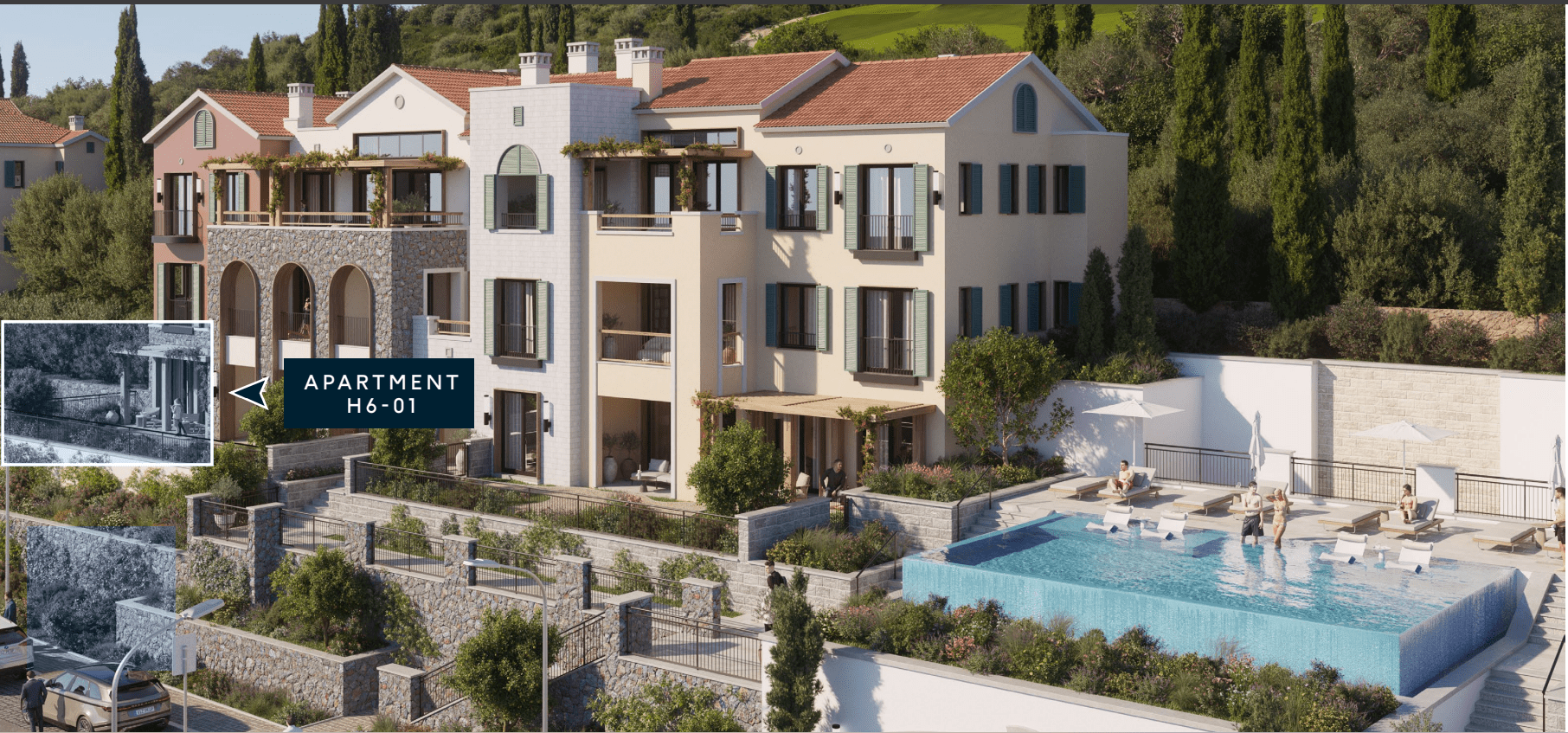 Horizon je utkan u pejzaž kroz kaskadne vrtove i mirisne staze oivičene čempresima. Određene rezidencije imaju direktan izlaz na privatne bašte kao što je slučaj sa apartmanom iz naše ponude, nudeći vam lični komad raja.