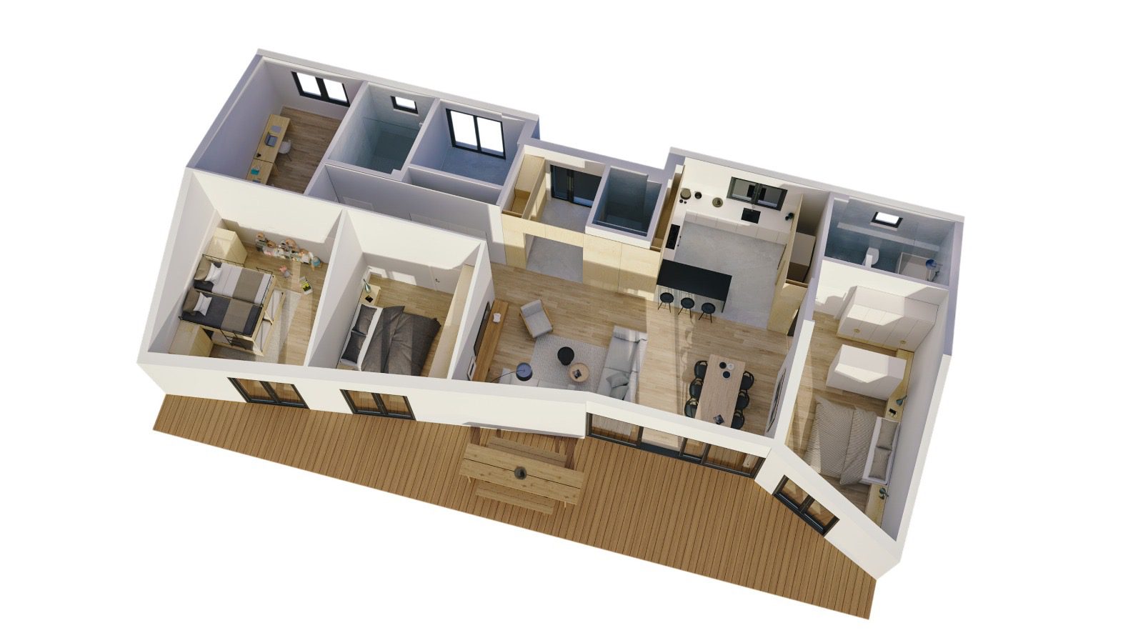 Kuća je savršeno projektovana, sastoji se iz komfornog open space prostora koji sadrži dnevni boravak i kuhinju sa trpezarijskim prostorm, 4 spavaće sobe (od kojih je jedna master soba sa svojim kupatilom), dva kupatila, gostinskog toaleta i ostave/tehničke sobe. Svaka soba ima izlaz na prostranu terase i na dvorište.