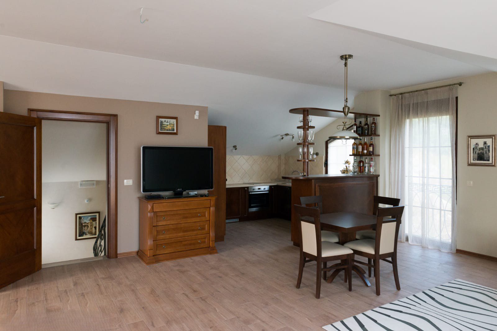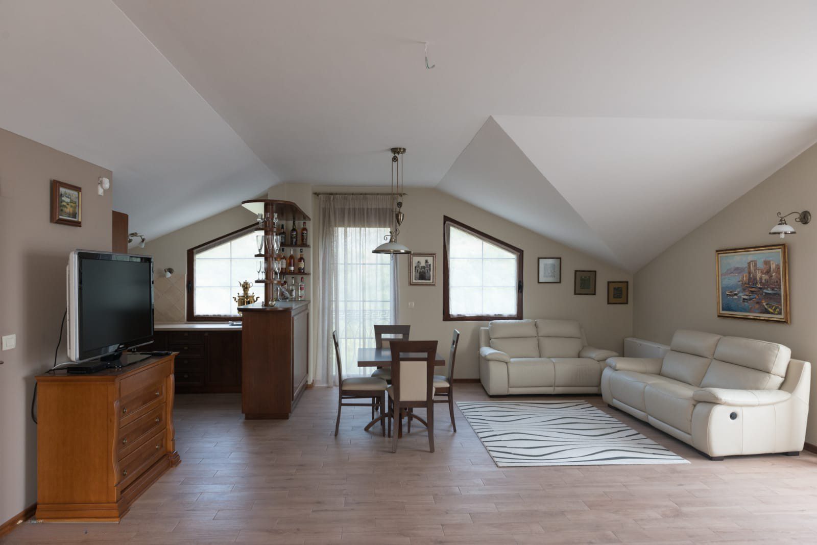Na potkrovlju je smješten studio apartman – soba, kuhinja, trpezarija, kupatilo i terasa.