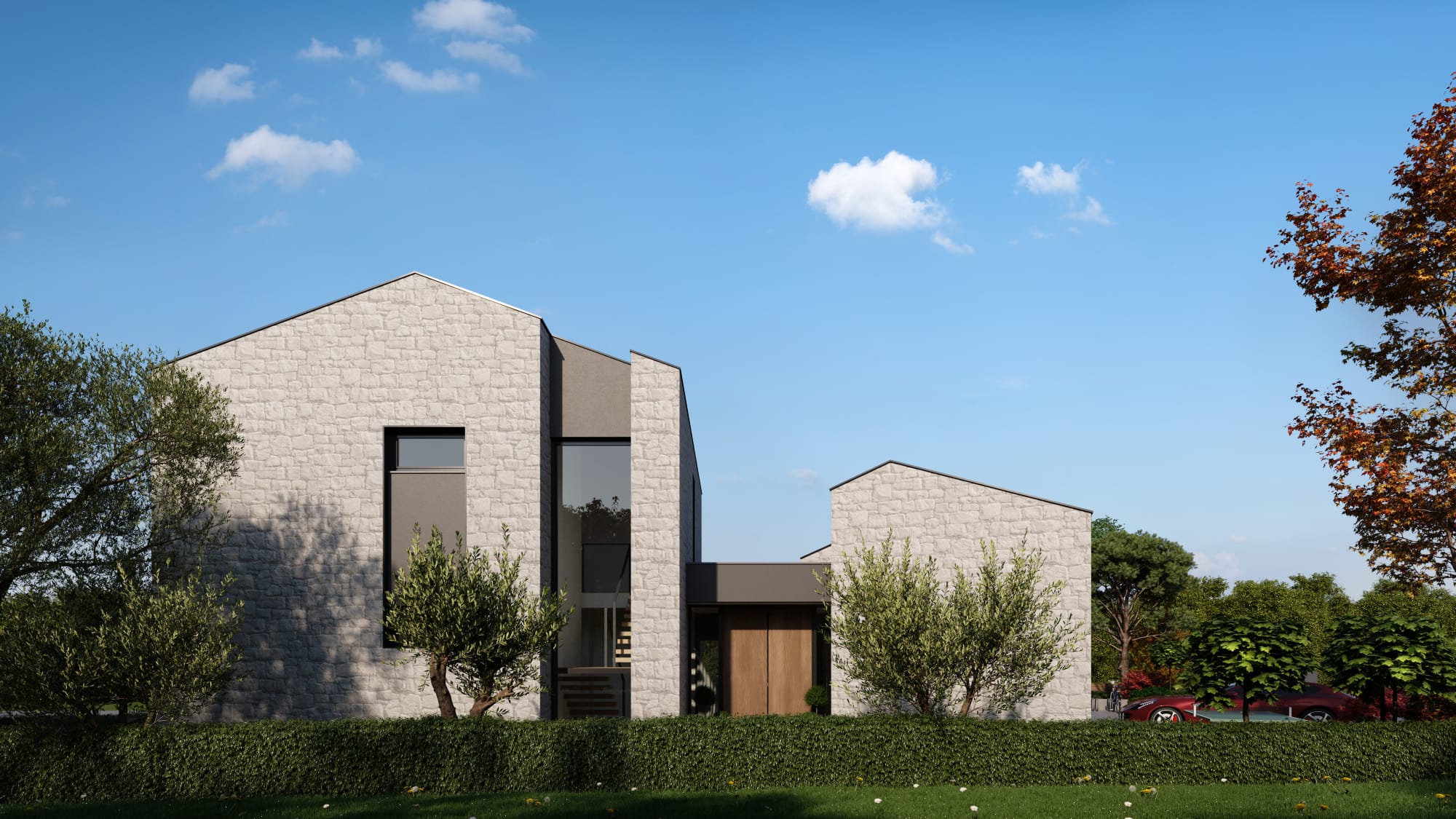 Ova prelijepa vila je smještena u fantastičnom ambijentu i okruženju sa kamenim vilama i porodičnim kućama. Udaljena je od centra grada i pješačke zone 4km. U neposrednoj blizini vile se nalazi i najstariji restoran domaće kuhinje sa domaćom prozvodnjom maslinovog ulja. Ceo objekat je urađen u kamenoj fasadi zidanog kamena sa termo izolacijom sa garancijom od 50 godina. Krov je potapajući od bijelog crepa posebno naručenog iz Italije. Cijelo dvorište je popločano prirodnim kamenom. Bazen je urađen u Italijanskoj keramici. Podovi unutrašnjosti su od prirodnog kamena i keramike. Objekat je sa podnim grejanjem i zidnim hlađenjem u odvojenim sistemima. Parking prostor je u italijanskim kamenim kockama oštrih ivica tipa kaldrme.