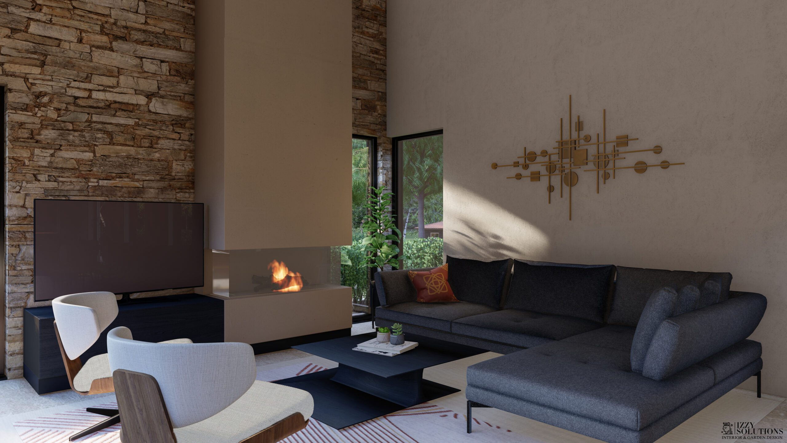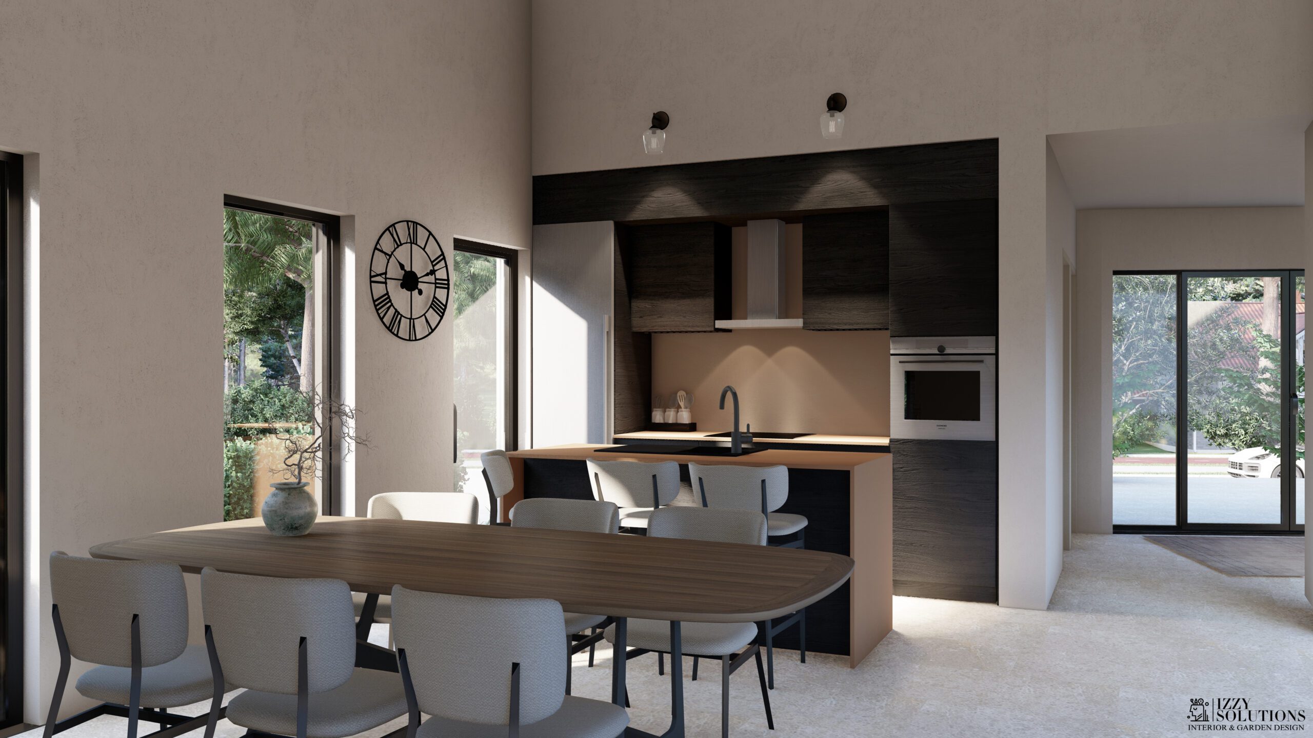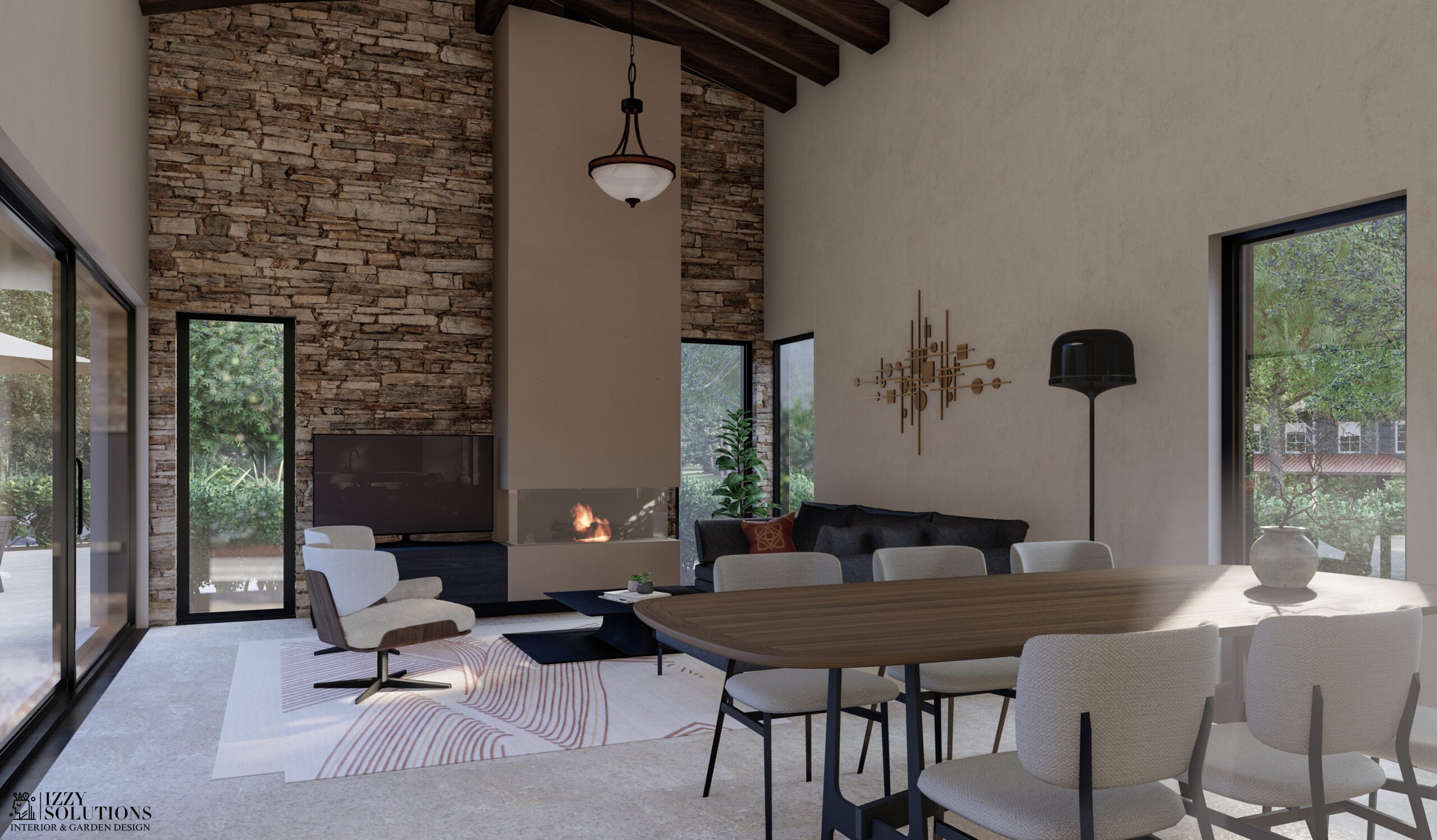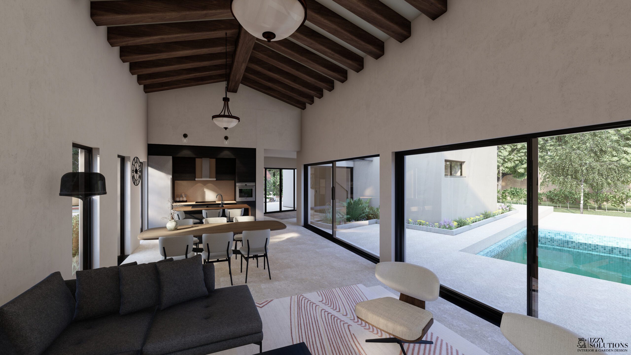 boravku je u najvišljem djelu 5,5m. Iz dnevnog boravka se kroz 8 metara staklenih podizno kliznih prozora izlazi na dvorište i direktno na