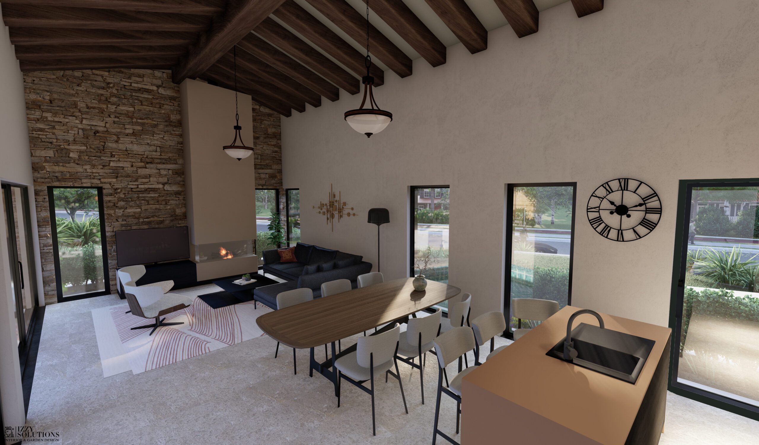 Dnevni boravak je veliki, površine oko 90m2 sa integrisanom kuhinjom koji ima i kamin. Visina plafona u dnevnom